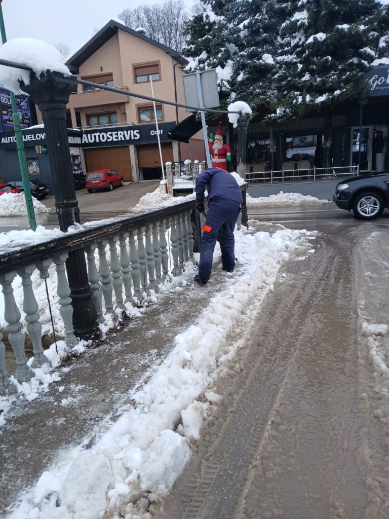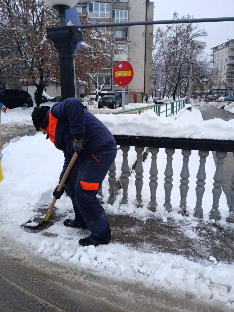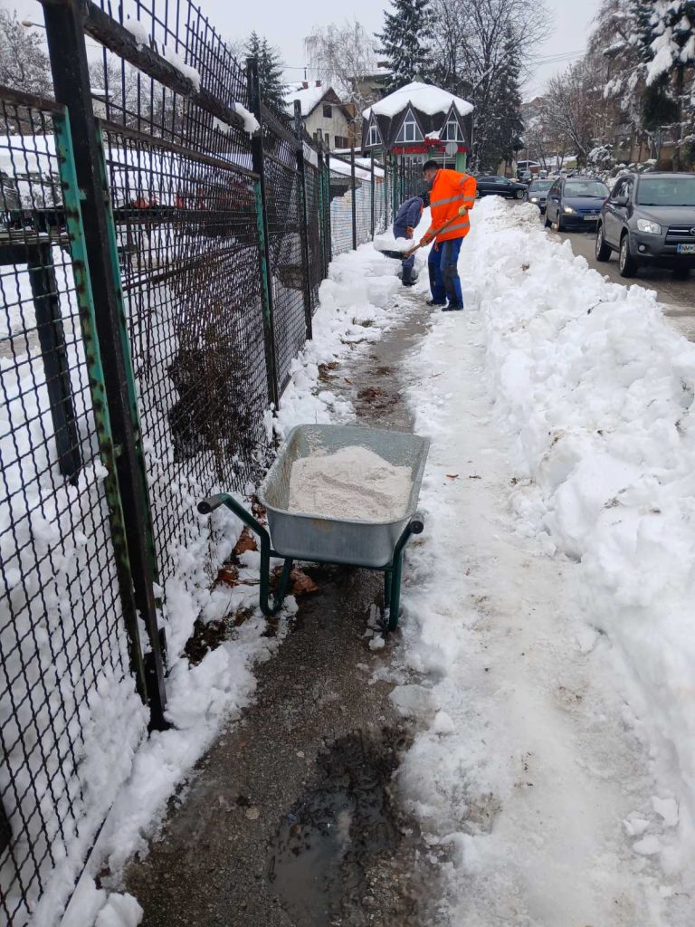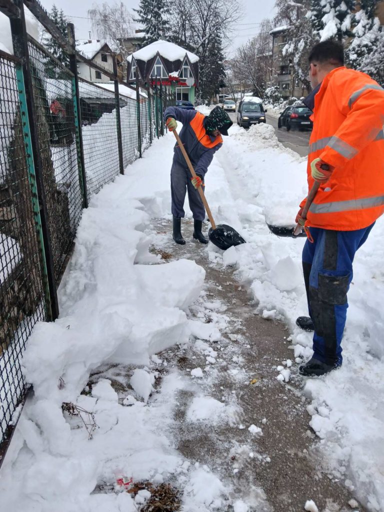 Sve dežurne ekipe i raspoloživa mehanizacija su i tokom protekle noći bili angažovani na terenu u svrhu intenzivnog čišćenja saobraćajnica, a u skladu sa planom i programom zimske službe te stanja i uslova na terenu. Nastavak spomenutih aktivnosti odvija se i u jutarnjoj odnosno dnevnoj smjeni. Od ranih jutarnjih sati angažovani su i radnici na ručnom čišćenju trotoara, mostova, stepeništa i sl.
